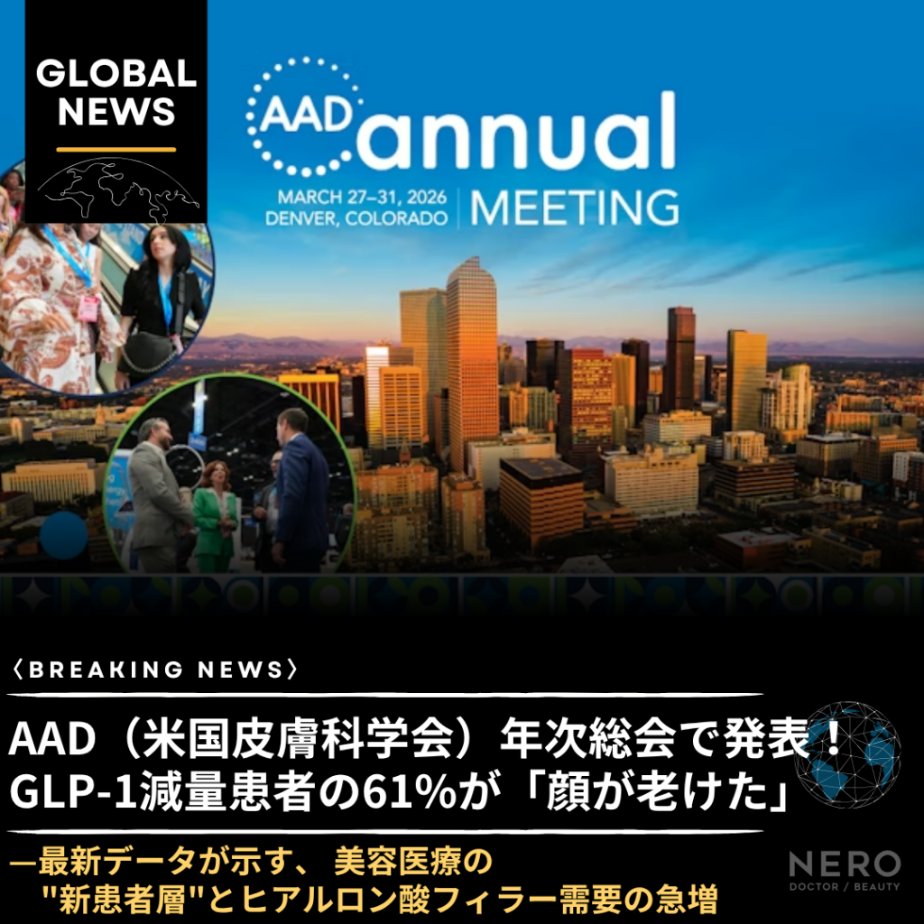 - GLP-1減量患者の61%が顔面ボリューム消失、50%が皮膚弛緩を経験(Allergan AAD 2026)