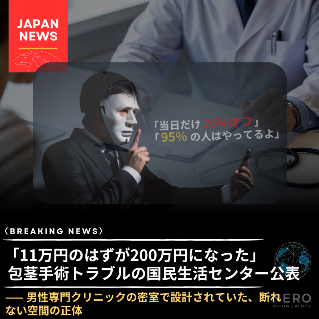 - 「約11万円で受けられる」という認識で来院した男性が、最終的に約200万円の契約に至った包茎手術トラブルを国民生活センターが2026年3月に公表